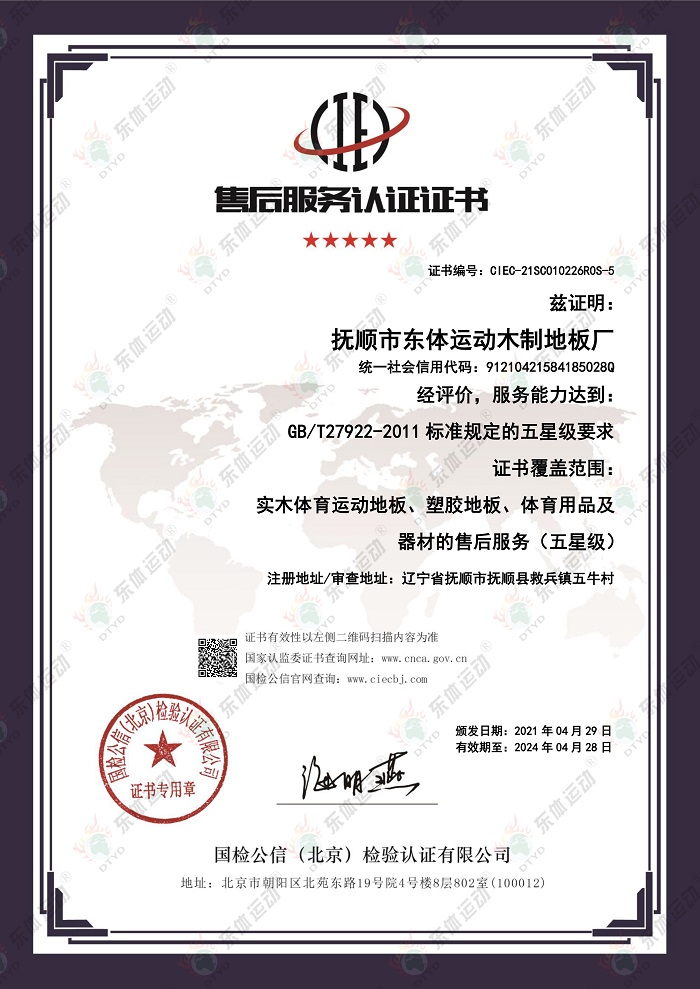 “東體運動”木地板系列產品已經通過國際籃聯(lián)檢測、世界羽聯(lián)認證、歐盟體育地板專項標準CE認證、歐盟環(huán)保產品CE認證、FSC世界森林協(xié)會認證、五星級售后服務企業(yè)認證等,是中國職業(yè)籃球俱樂部遼寧沈陽三生飛豹籃球俱樂部官方合作伙伴,內蒙古籃球協(xié)會戰(zhàn)略合作伙伴。